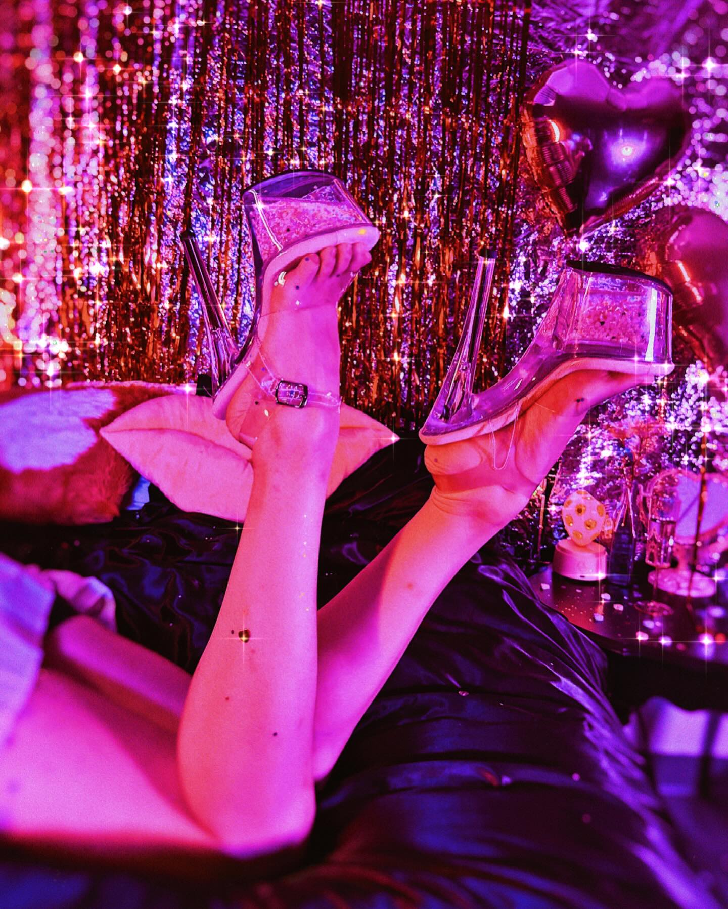 Chaque jour peut être la Saint-Valentin, avec ces magnifiques sandales à talons de 7 » (178 mm), 2 3/4 » (70 mm) à bande plateforme, ornées de liquide fluide et de cœurs pailletés flottants.