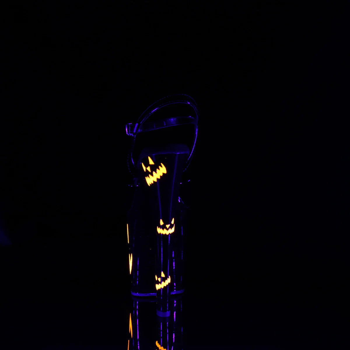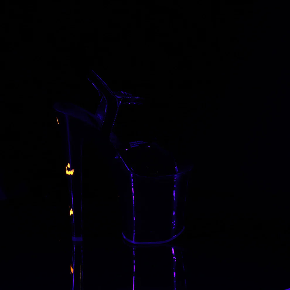 Laissez-vous aller toute l’année à l’ambiance d’Halloween avec ces sandales accrocheuses! Le talon de 8 » (200 mm) et la plateforme de 4 » (100 mm) sont rehaussés par des paillettes orange réactives à la lumière noire UV, avec des visages amusants et effrayants de citrouilles-lanternes imprimés sur le bas de la plateforme. Parfait pour ajouter une touche ludique à vos tenues et embrasser l’esprit festif avec style.