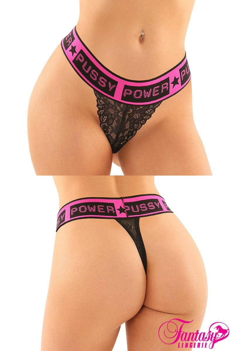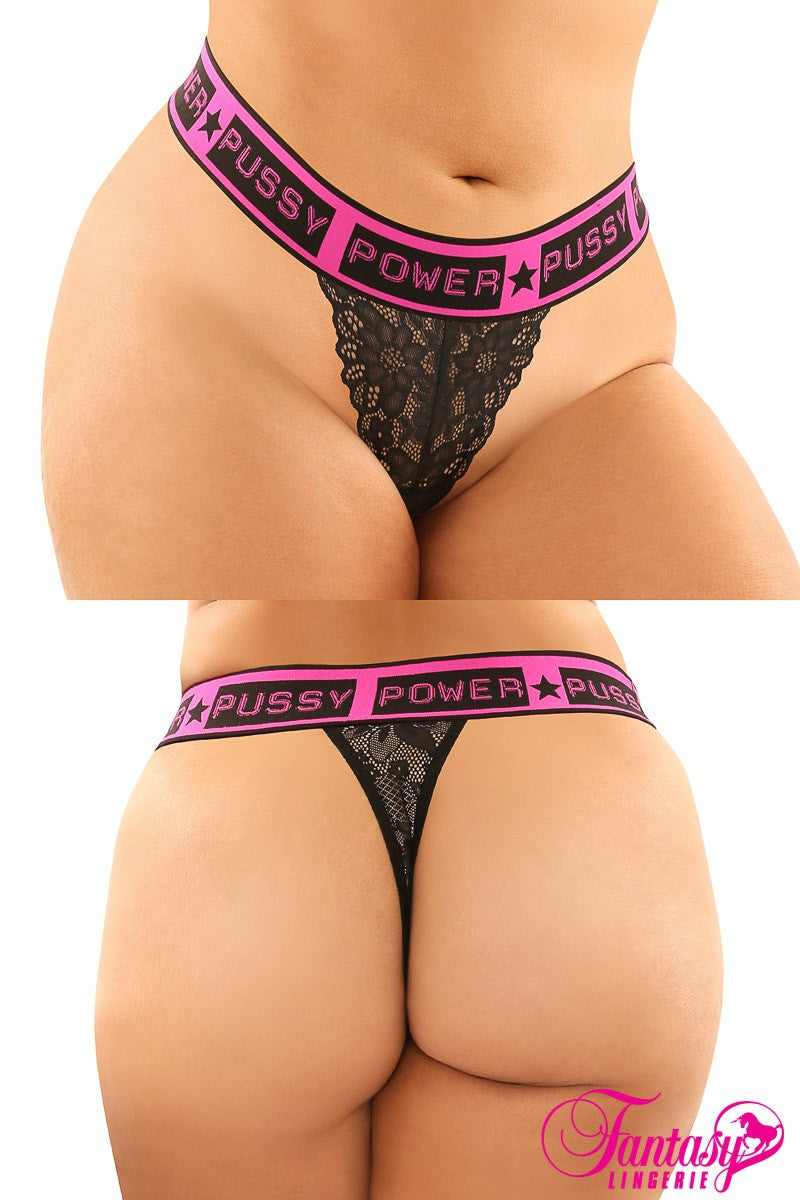 Sac de culotte avec deux culottes avec une ceinture élastique arborant un imprimé audacieux « Pussy Power ». Cet ensemble comprend un string en dentelle taille haute avec une ceinture élastique, un gousset en coton doublé et une culotte opaque sportive avec une grande ceinture et un gousset en coton doublé. (Coffret 2PC; tous les designs inclus dans un seul forfait)