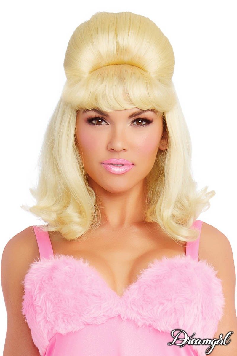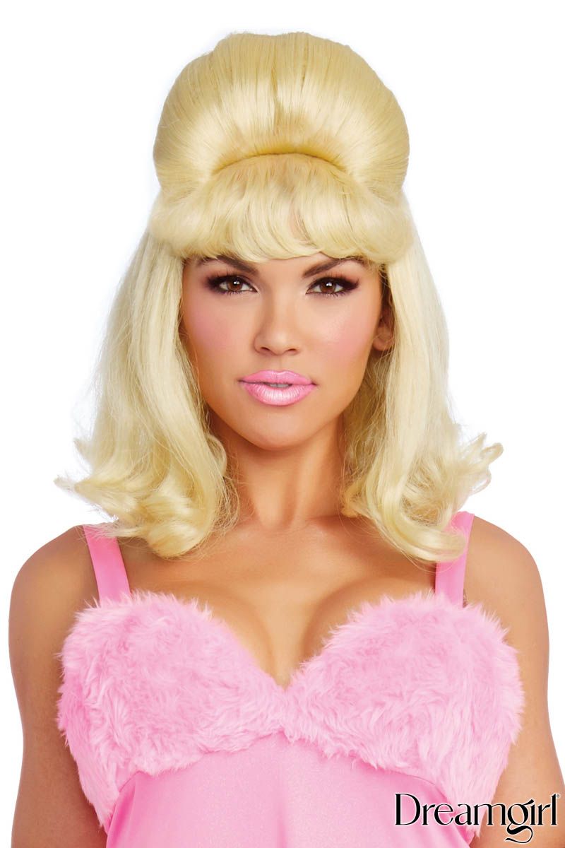 Perruque bouffante ajustable à la longueur des épaules, inspirée rétro, avec une bosse haute, une frange et une casquette résille intégrée.