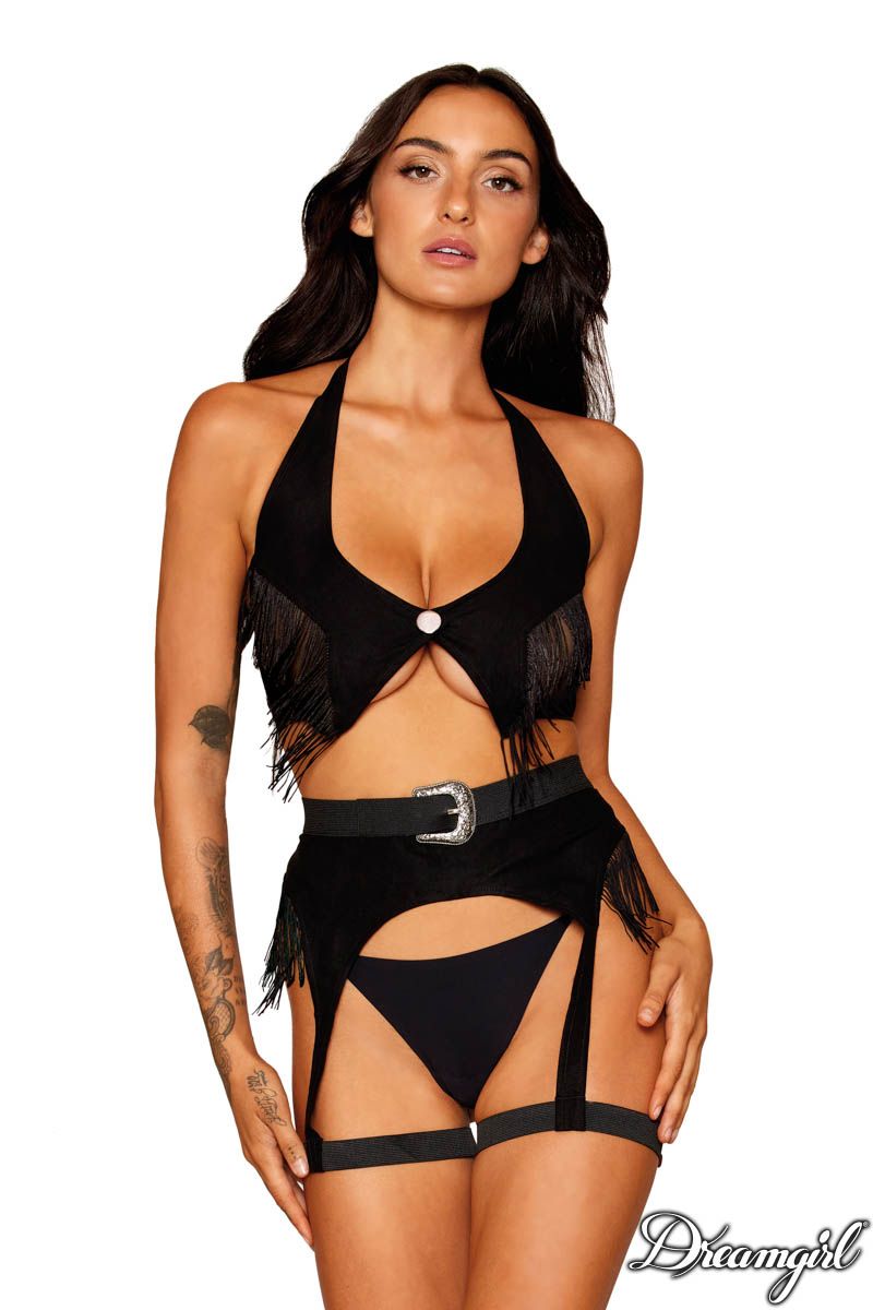 Entrez dans une sophistication sensuelle avec notre haut en faux suède élégant, orné de longues franges tombant sur une poitrine ouverte audacieuse. Le col à col licolé et les fermetures à double attache renforcent l’attrait du dos ouvert. Associé à une jarretière taille haute, ornée de franges marquées sur les côtés, d’une boucle décorative argentée de style occidental, et d’une fermeture à crochet et boucle ajustable sur une taille épaisse, cet ensemble assure un ajustement parfait. Des jarretières élastiques, attachées à de grosses jarretelles élastiques, complètent le look, ajoutant une touche de style western à votre garde-robe intime.