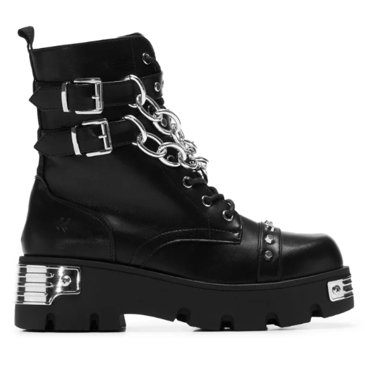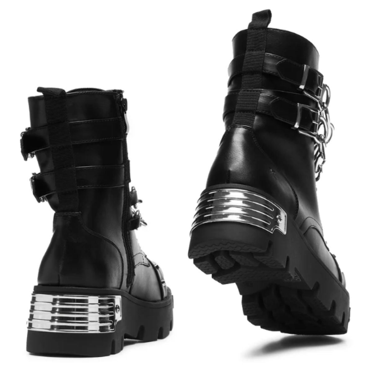 Les bottes Shackled Shadows misent sur l’attitude robuste. Construites sur une semelle extérieure solide et massive avec des plaques métalliques à l’orteil et au talon, ces bottes apportent ce grain industriel pour lequel KOI est reconnue. Mais ce sont les détails qui les amènent à un autre niveau — comme la forme carrée du bout et les chaînes argentées surdimensionnées drapées sur le devant. Les sangles à double boucle maintiennent tout verrouillé, avec les boucles argentées assorties parfaitement synchronisées avec les chaînes. Le faux cuir noir texturé complète le tout, donnant à l’ensemble une ambiance rugueuse et rebelle.