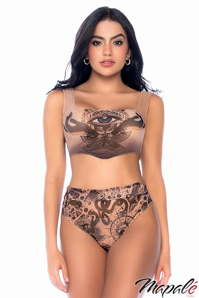 Haut en maille nude transparent avec un décolleté carré, des imprimés tatoués colorés et des bretelles épaisses fixes. String tatoué taille haute transparente à imprimé nude