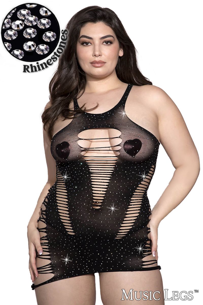 Robe en maille ajustée avec un décolleté carré haut, des découpes basses et plongeantes avec des élastiques croisés et des strass scintillants. (Corde de sol non incluse)