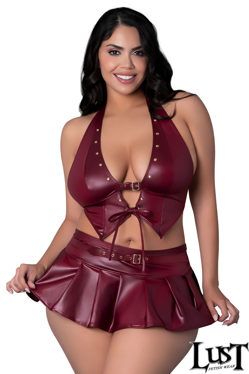 Glossy four-way stretch wet look top with an adjustable buckle over the plunging front, soft cups, a halter tie-neck collar and a tie-front closure. Pleated mini skirt with a wide waistband and G-string.