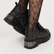 Unleash chaos. This all-black beast is the darker, harder evolution of our OG Rimo style. Covered in jet black spikes and armoured dragon hardware, the Thurnax is a shadow-dwelling icon for the bold. Metal-plated heel details and double-stacked soles bring the drama — just add attitude.