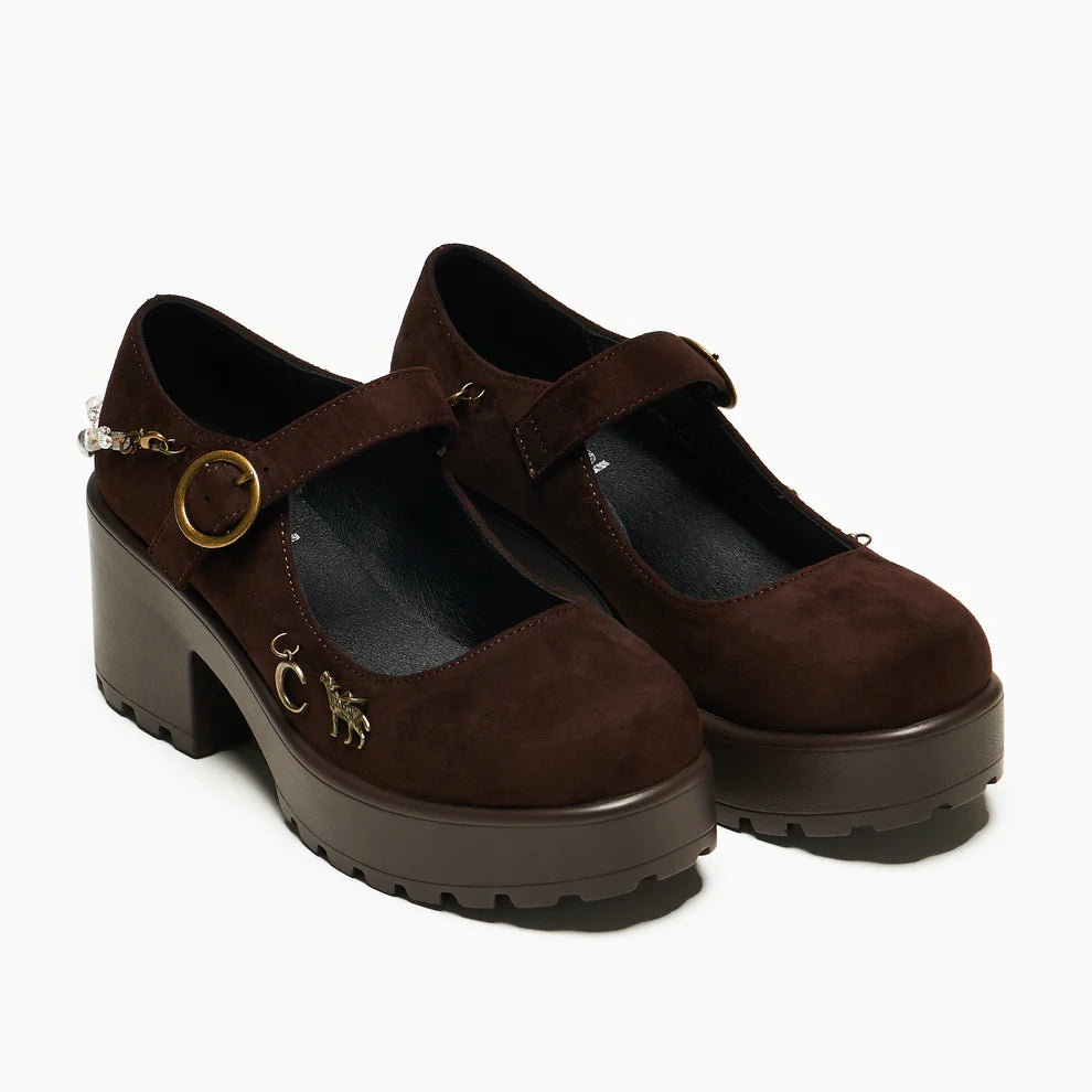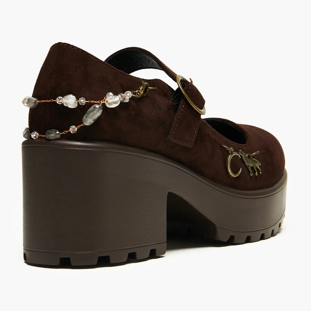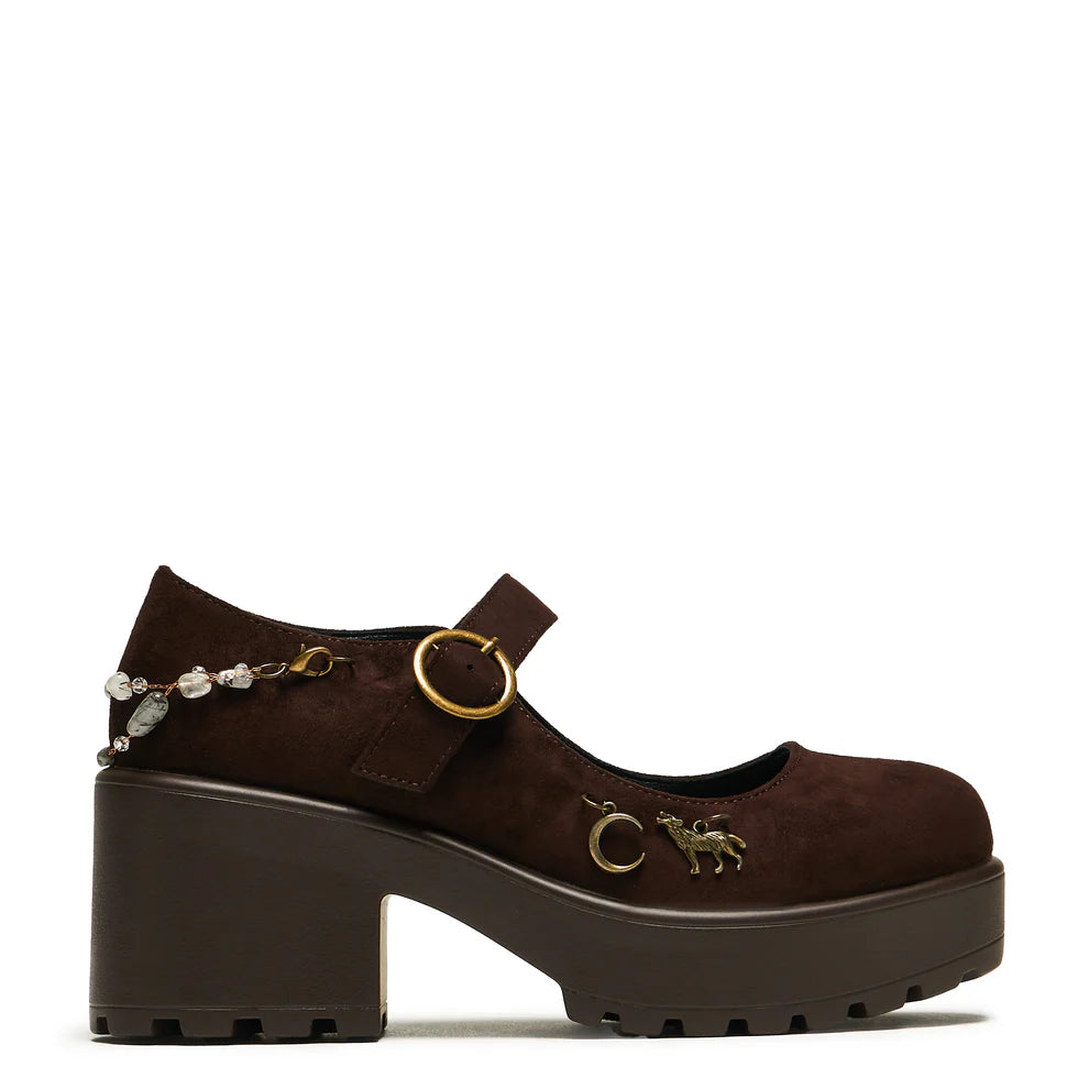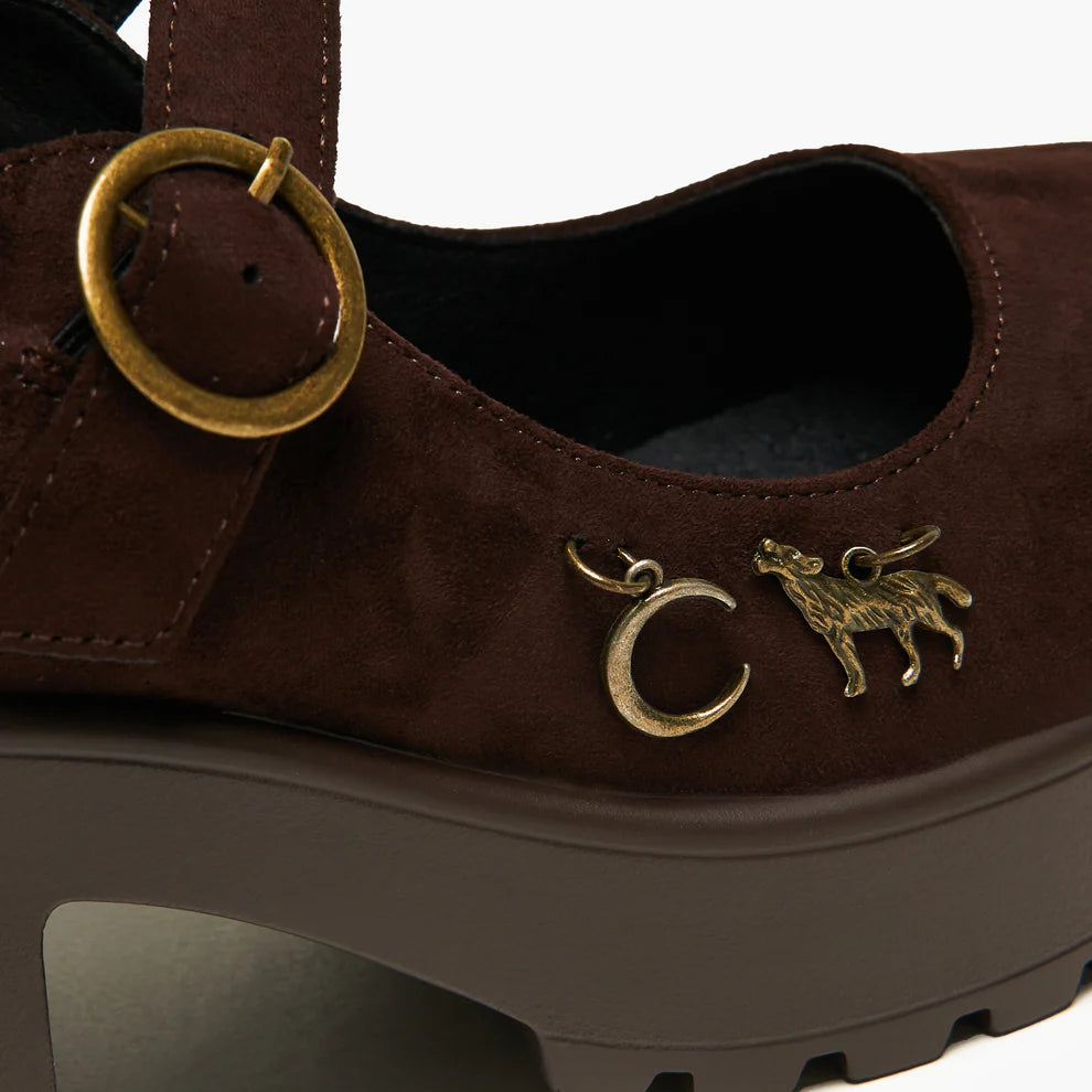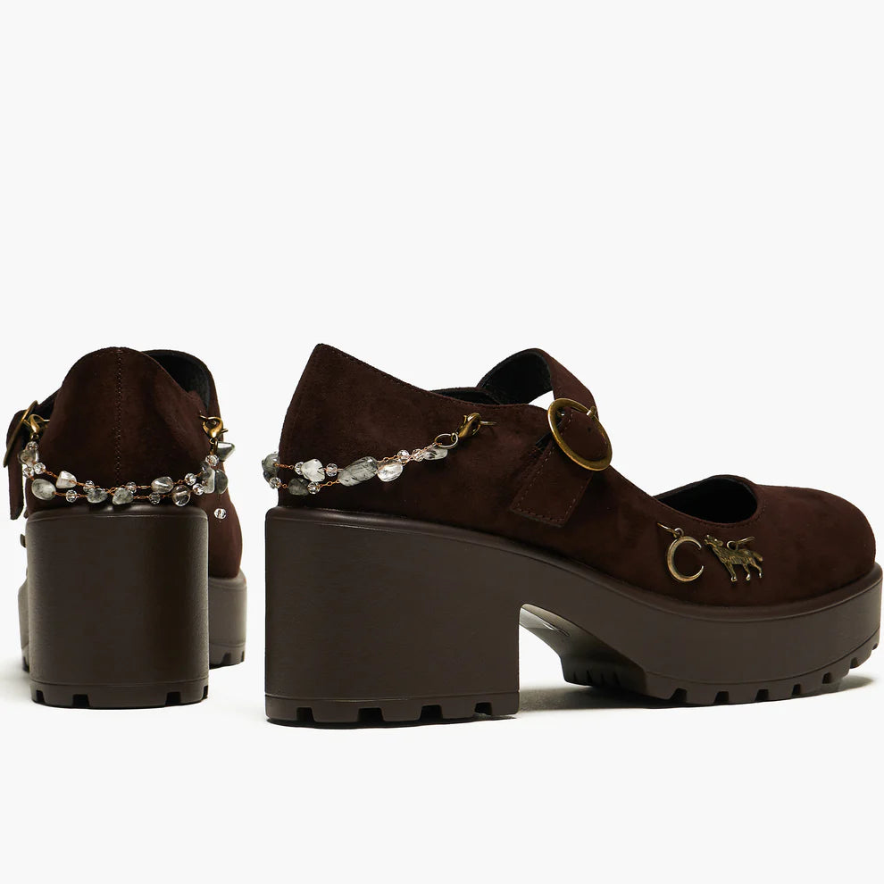 Our classic bestselling may jane with a wolfy twist, named after what the wolf pack in Twilight who truly are "shapeshifters." Designed with the wolves in mind, imagining them running through the forest, so we added nature elements to this design. Faux suede in earthy tones, warm and fur like contrast with the vintage style metal buckle and charms and rough gemstone chain. The wolf charm references the one that Jacob carved out of wood for Bella’s charm bracelet, paired with a lunar charm making these.. Wild perfection. (The chain is hooked on with a clasp and is detachable, we recommend taking the chain off if you plan to use the shoes heavily)