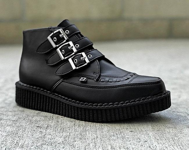 Gardez votre style affûté avec ces bottines rocker creeper à la cheville qui offrent le même style audacieux et iconique de TUK dans un Végane Option alternative. Comprend une tige entièrement noire fabriquée en notre matériau synthétique de haute qualité en TUKń� 'Äî, un faux cuir synthétique poliable, à la fois doux et respirant. Il possède une boucle métallique à trois sangles avec une semelle basse mesurant environ 1 ¬º’Äù au talon et ¬æ’Äù à l’avant. Comprend des semelles intérieures en gel amovibles pour plus de confort. La chaussure peut être facilement nettoyée avec du savon doux et de l’eau. C’est un style UNISEXE. Si vous souhaitez acheter une taille pour femmes, veuillez soustraire 2 tailles pour les convertir en tailles pour hommes. Par exemple, si vous souhaitez commander une taille 7 pour femmes, veuillez commander une taille 5.