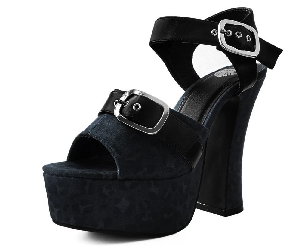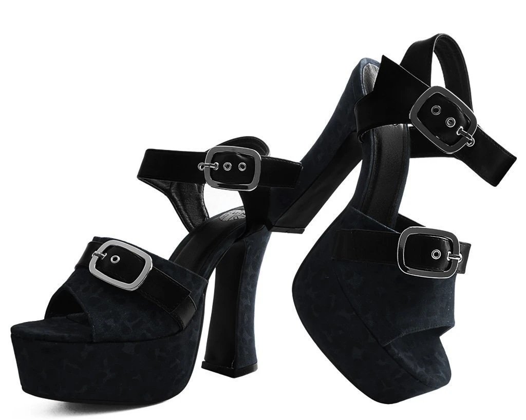 Pimentez votre vie à un tout autre niveau avec ces sandales à plateformes chics! Présente une tige en microfibre léopard grise contrastant avec des sangles à boucle noire. Il a une hauteur de talon solide de 5 » complétée par une plateforme de 1 3/4 ». Végane amical et fait de matériaux entièrement artificiels.