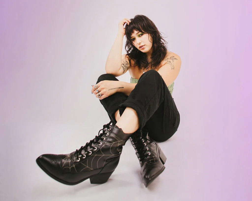 Des chaussures pour faire ressortir ton côté sombre. Comprend un Végane Une tige amicale en simili cuir noir avec une construction à bout pointu, des détails en toile d’araignée et une fermeture à 8 œils. Il a une hauteur de talon en bloc de 2 1/4".
