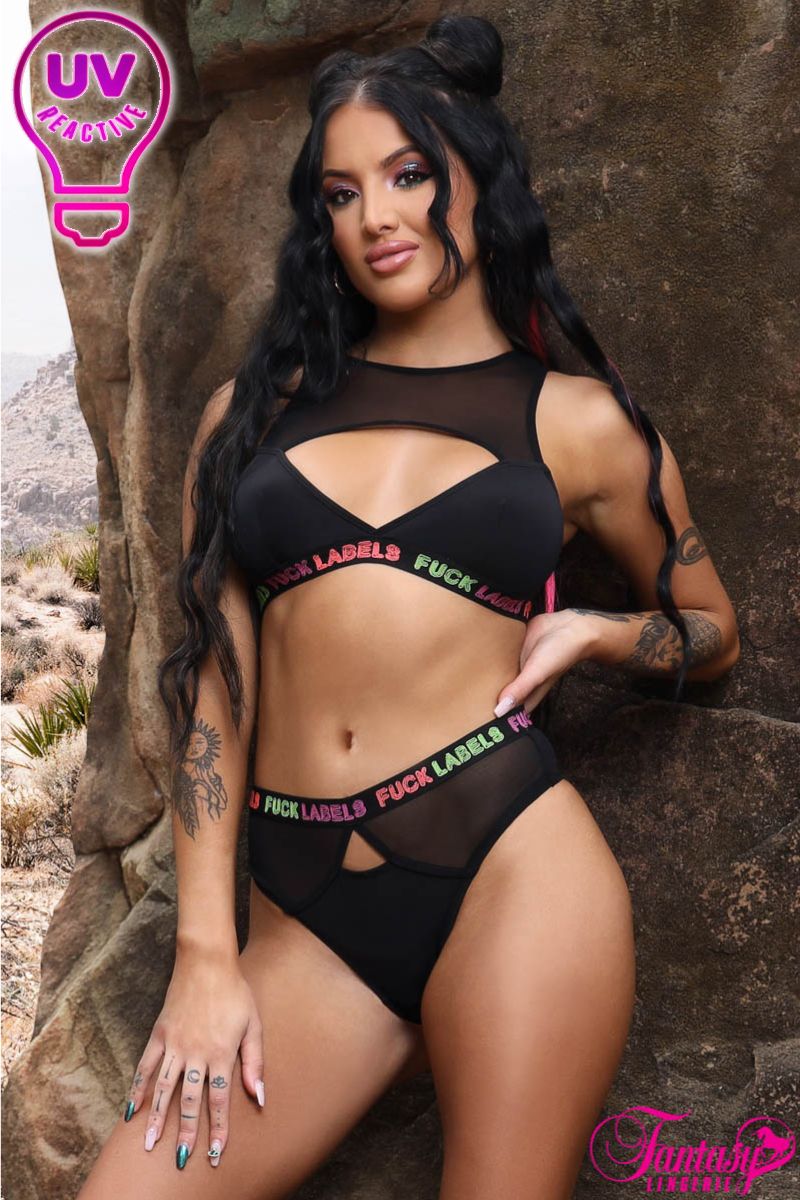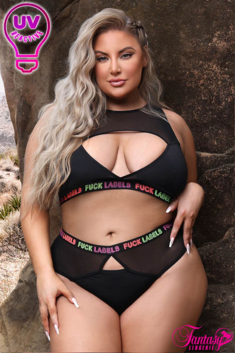 Faites une déclaration avec ce haut opaque audacieux et inclusif et cette culotte taille haute, avec un décolleté en mesh transparent haut, un large devant découpé et une poitrine épaisse avec un imprimé arc-en-ciel « FUCK LABELS » réactif aux UV. La culotte assortie arbore une large ceinture élastique avec le même imprimé et un haut transparent découpé, ajoutant une touche de style audacieux à cet ensemble valorisant. Parfait pour ceux qui recherchent un ajout unique et inclusif à leur collection de lingerie, cet ensemble saura vous faire sentir confiant et autonome.
