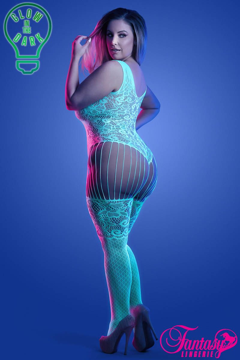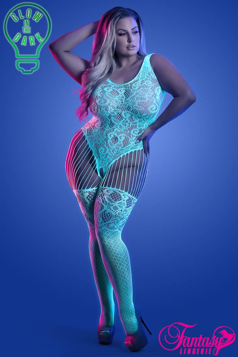 Bas de corps en dentelle florale réactive aux UV avec bretelles fixes épaisses, entrejambe ouvert et bretelles élastiques déchiquetées sur les cuisses reliées à des bas hauts en dentelle assortis. (String non inclus)