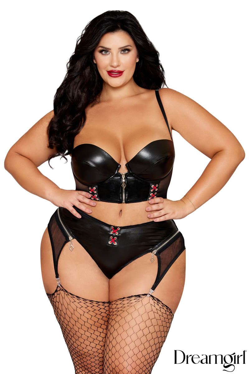 Cet ensemble comprend un soutien-gorge long, élastique, brillant et mouillé, avec des bonnets doublés de mousse à armatures, un dos en filet transparent, des bretelles ajustables amovibles et une fermeture éclair à l’avant. Il comprend aussi une gartini en simili cuir avec un dos en treillis taillé en string, des côtés zippé et de petites jarretières fixes.