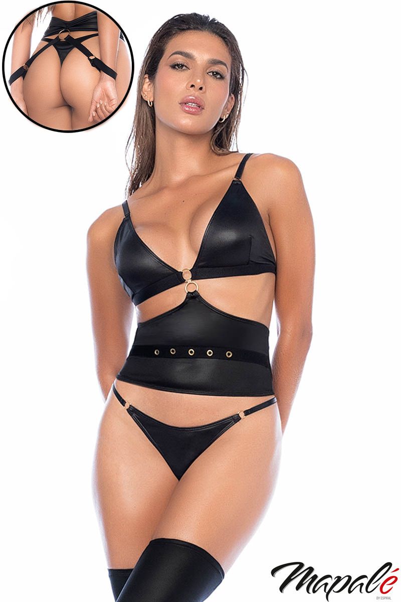Soutien-gorge stretch brillant avec bonnets triangulaires, bretelles ajustables et fermeture à crochet et œillet. Harnais de poitrine avec fermeture à crochet supérieur, poignets élastiques attachés dans le dos et œillets décoratifs en or. String mouillé