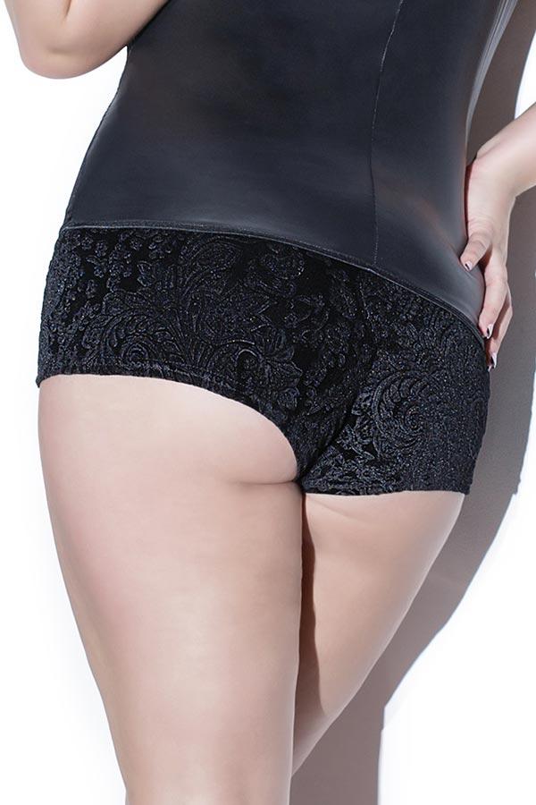 Un short mouillé mat extrêmement sexy avec dos et panneaux latéraux en velours embossé.