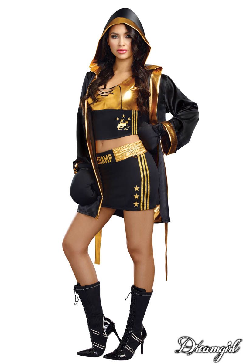 Entrez sur le ring avec style avec cette robe de boxe en satin noir ornée d’une ceinture dorée brillante et d’une jupe sérigraphiée conçue avec une boucle pour tenir les gants. Le toit à lacets, orné de rayures dorées brillantes et de « CHAMP » sérigraphié à l’avant, ajoute une touche supplémentaire digne d’un championnat.