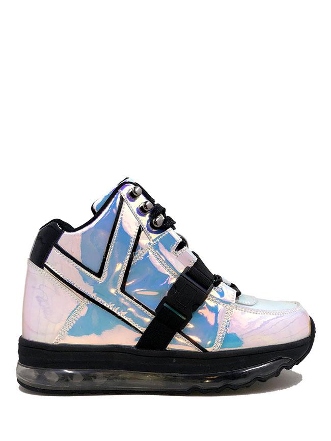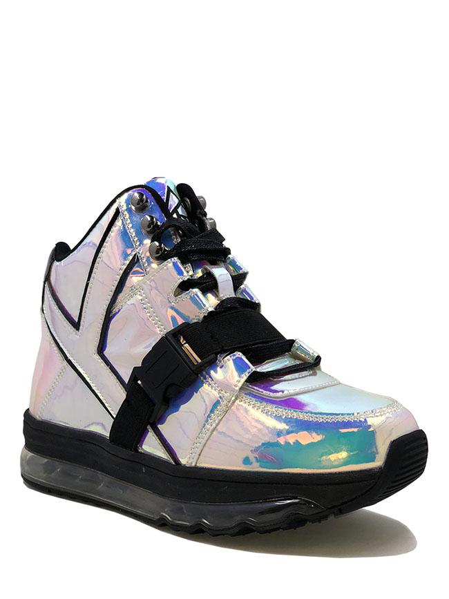 Atteignez de nouvelles dimensions avec ces espadrilles funky avec le tissu hologramme le plus rare de YRU à ce jour. Réfléchissez les prismes à chaque pas dans les semelles d’air lumineuses flottantes, hauteur de plate-forme de .75". S’allume : rose, bleu et vert Dure environ 50 000 pas