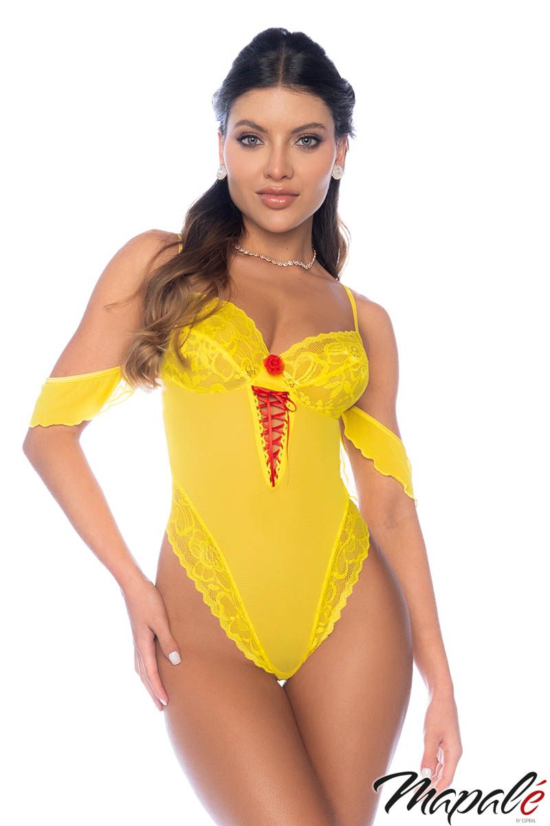 Bring the tease in this sheer mesh teddy with thick lace trim, soft lace cups, and an adjustable ribbon lace-up front. Finished with adjustable straps, mini side straps, and hook & eye closures at the back and crotch.