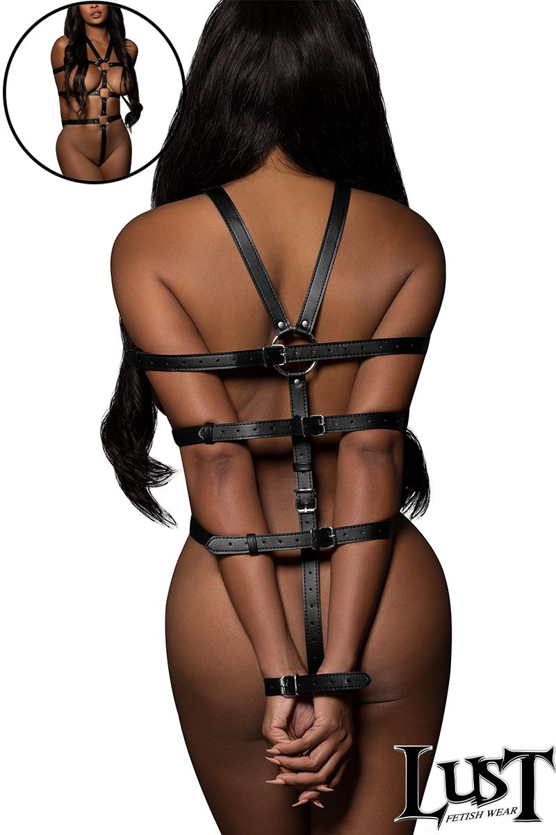 1PC soft nubuck leather full-body harness featuring a durable polyurethane coating, big decorative metal rings, a fully open bust, 3 thick adjustable straps that can restrain the arms and a wide belt-style adjustable back strap.
