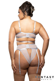 Floral lace bra with underwired cups, adjustable straps, a silky underbust strap and 2 hook & eye back closures. Lace garterbelt with adjustable front garters and an hook & eye back closure. Low-waist floral lace panty with adjustable sides and an open back showcasing the rear.