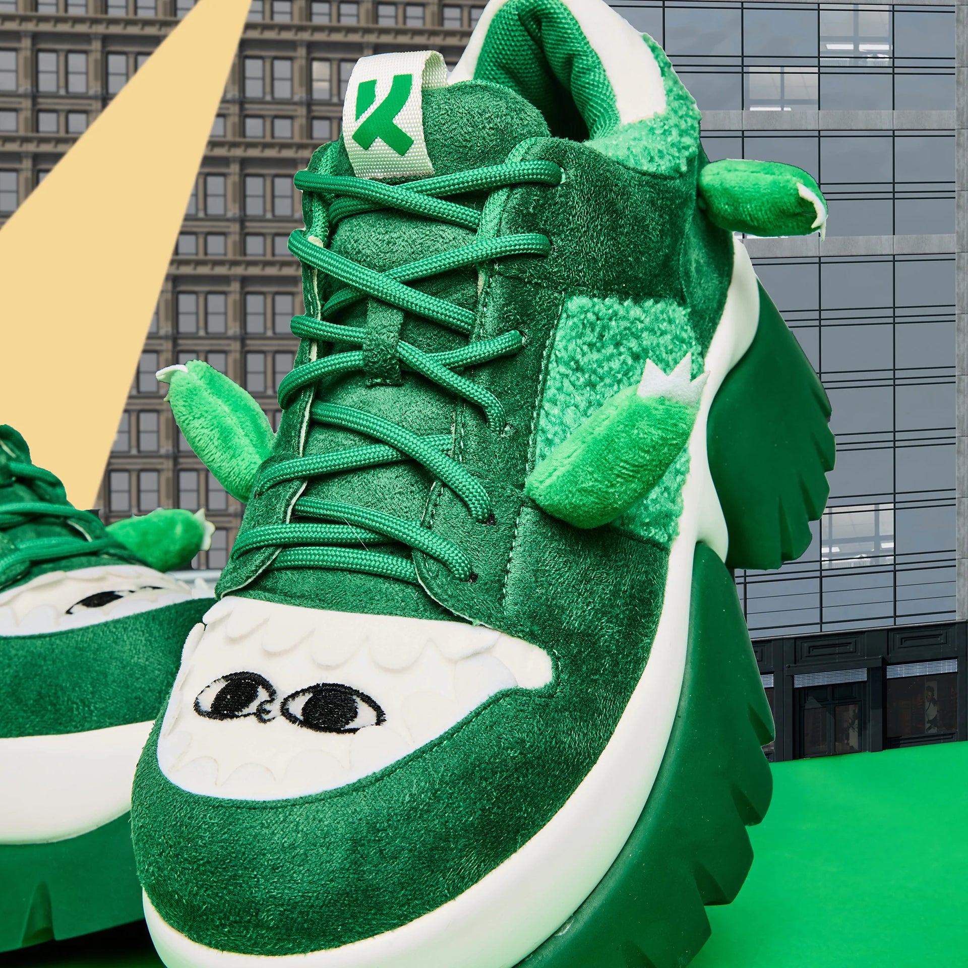 RAWR means "I love your shoes" in Beanzilla. These plushy, powerful platform trainers unleash the inner monster in the cutest way possible. With fuzzy green panelling, scalloped “teeth” trim, and Bean’s sweet little embroidered face peeking out from the toe, they’re equal parts adorable and unstoppable. Oh, and the plush arms? They’re ready for a hug... or a dramatic stomp through town. Limited edition – collect before they go extinct!