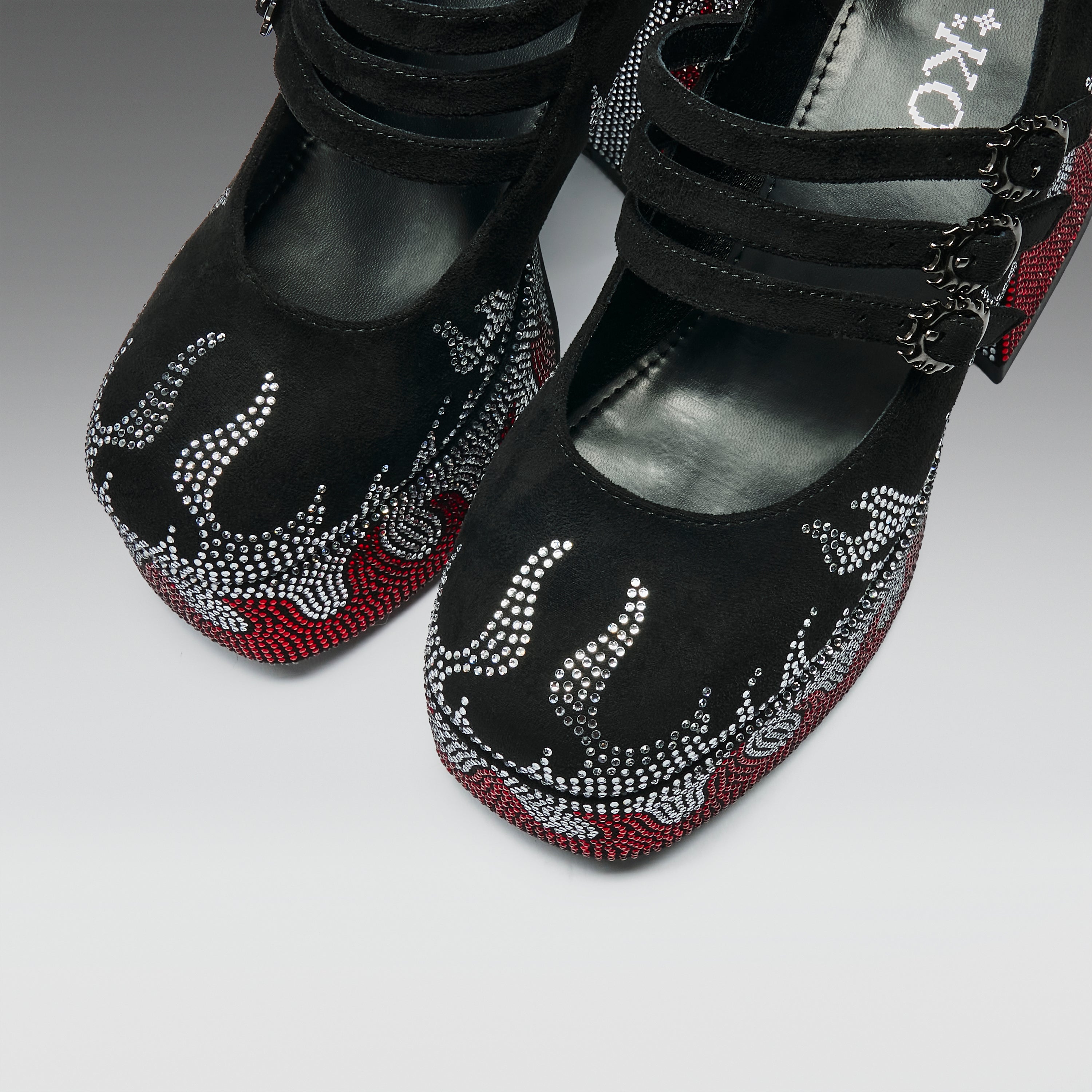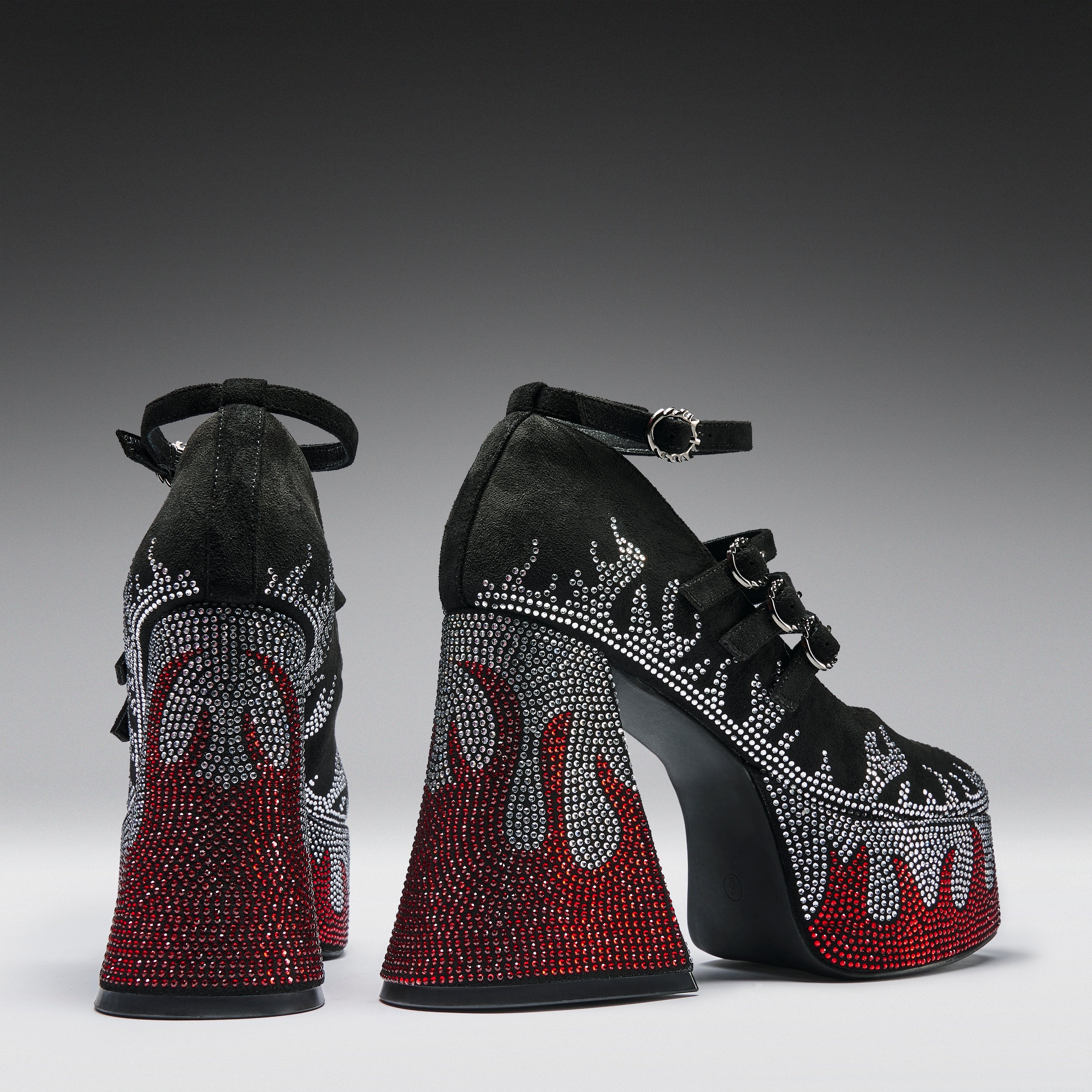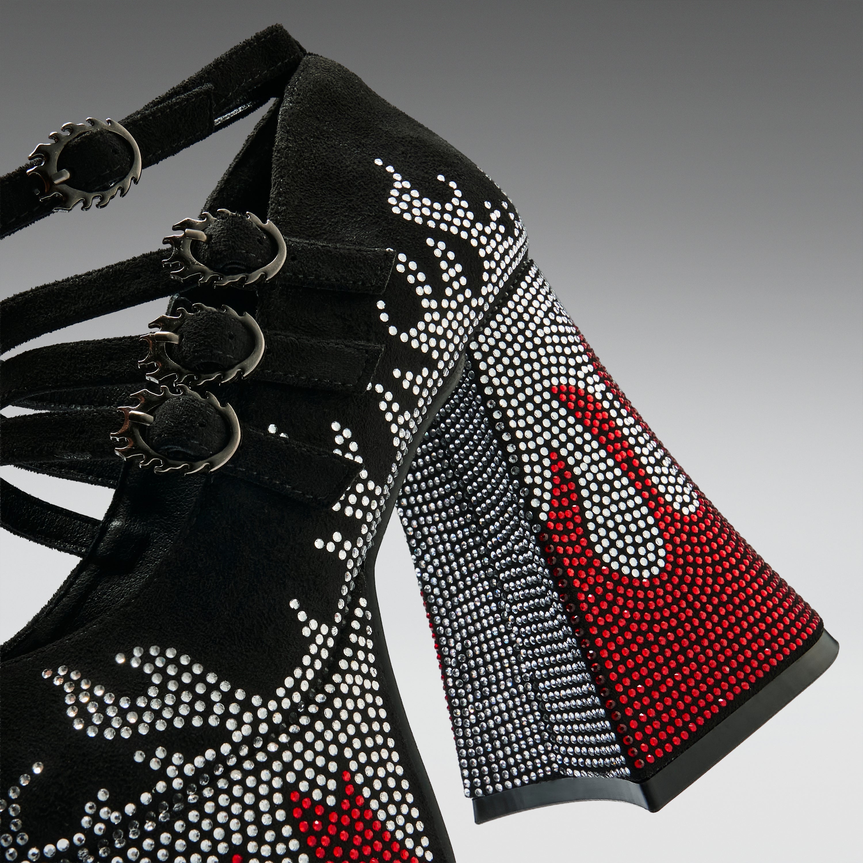 The upper switches from open straps to a closed toe in black suede-look material, with crystal flame detailing continuing across the front and sides. Three straps cross the foot, each fastened with spiked, gear-shaped buckles that feel industrial and aggressive. An ankle strap with a matching spiked buckle finishes it off. The hardware here isn’t polished and pretty. It’s sharp, textured, and built to contrast the crystals underneath.