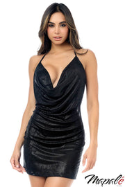 Glossy dress with soft cups, a cowl neckline and a halter a tie-neck collar. (G-String not included)