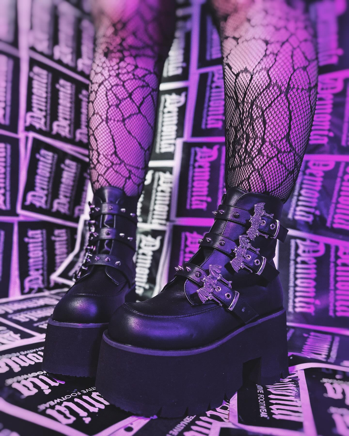 Fun & funky 3 1/2" (90mm) chunky heel cut out platform ankle boot featuring 3 studded bat buckle straps.