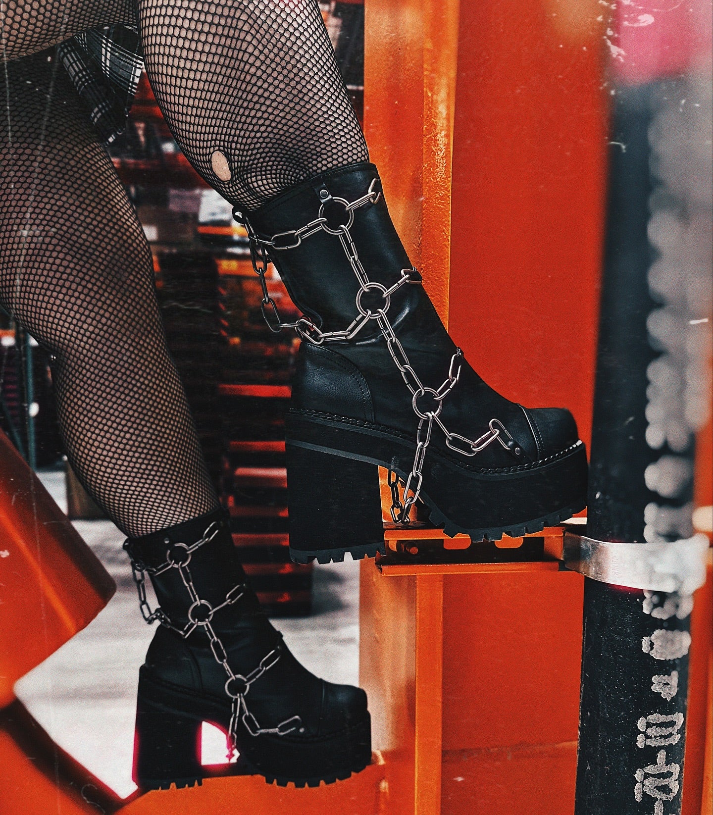 Stomp around in these 4 3/4" (121mm) block heel, 2 1/4" (57mm) cleated platform ankle boots featuring metal cage chain detailing on the vamp and full front metal zip closure.