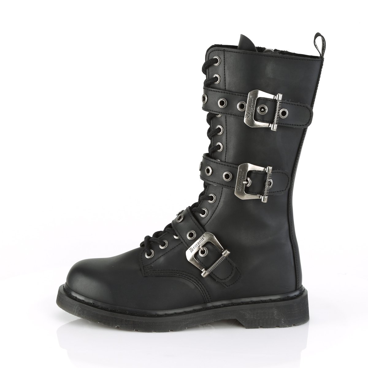 Slick 1 1/4" (32mm) heel 14 eyelet unisex mid-calf combat boot featuring triple buckle straps, inside zip closure.