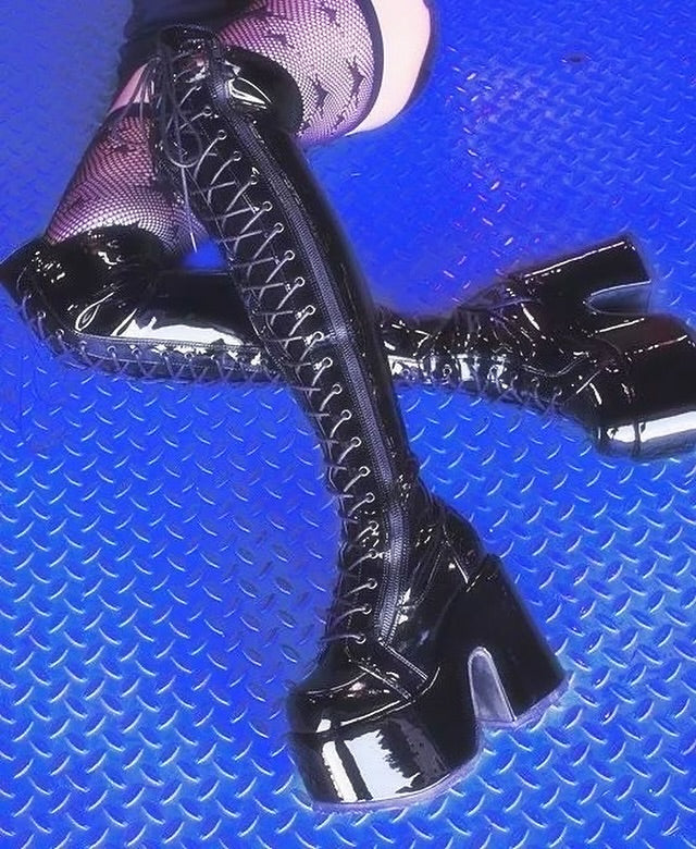 Fashionable 5" chunky heel, 3" platform lace-up stretch thigh-high boot with full length outside metal zipper.