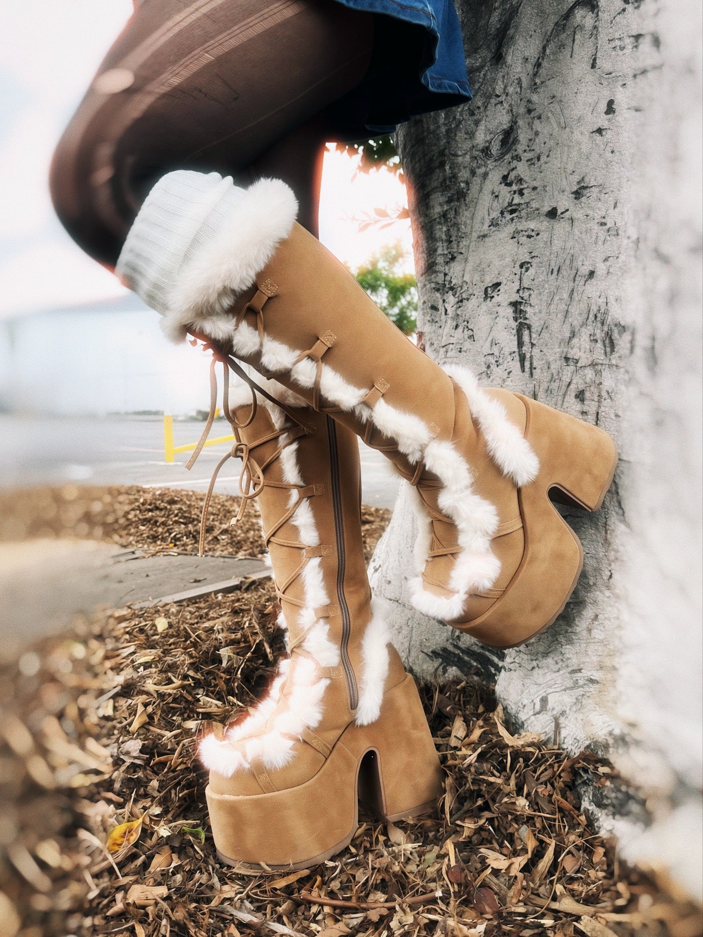 - Black faux suede knee-high boot with faux fur lining and trim