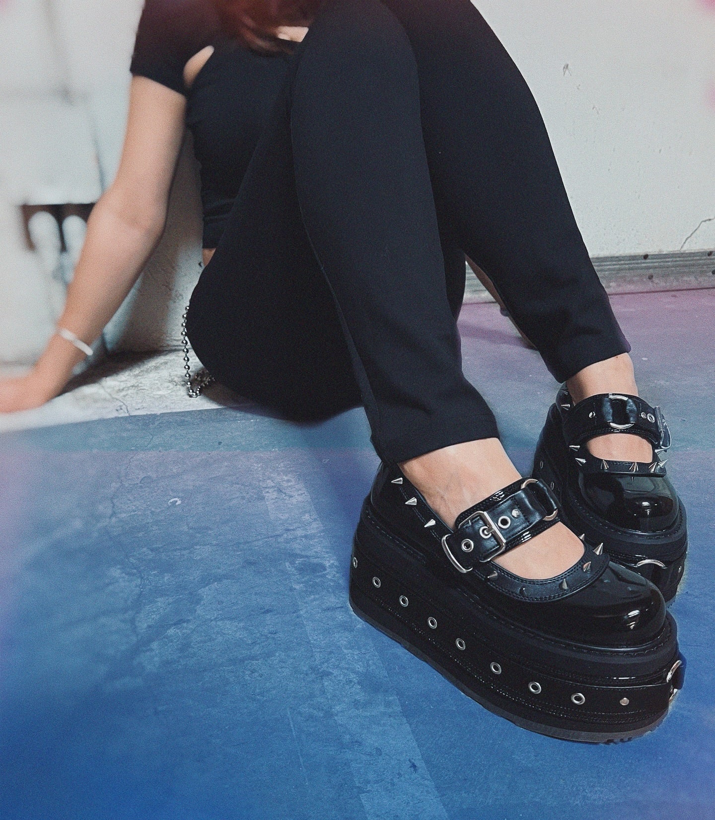A sophisticated Mary Jane shoe design, featuring a 3 1/2" (90mm) platform adorned with cone spike studs on the vamp trim. The buckle straps with O-ring and metal eyeletted detail on the platform add a touch of elegance and style.