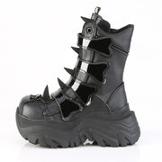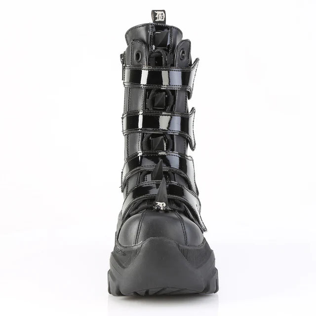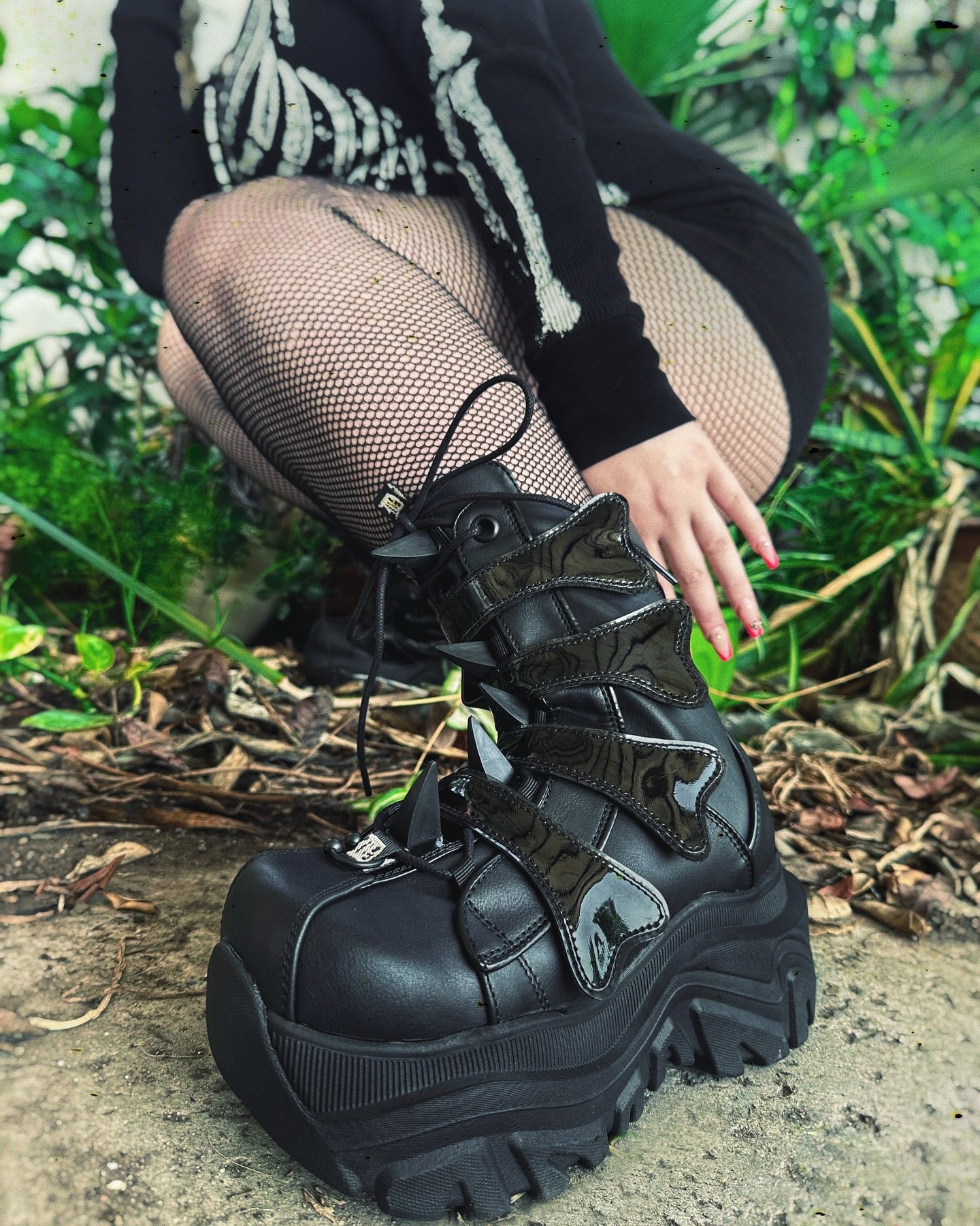 This calf boot boasts a 3 1/4" (83mm) flared platform with contrasting bone-shaped hook-and-loop straps, a claw rubber spiked tongue, and a horseshoe ring ornament. It includes an inside metal zip closure for added convenience.