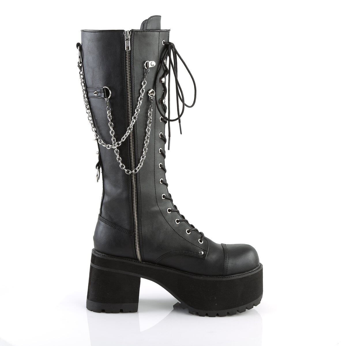 Solid and edgy 3 3/4" heel, 2 1/4" platform knee high boot with metal side zip.