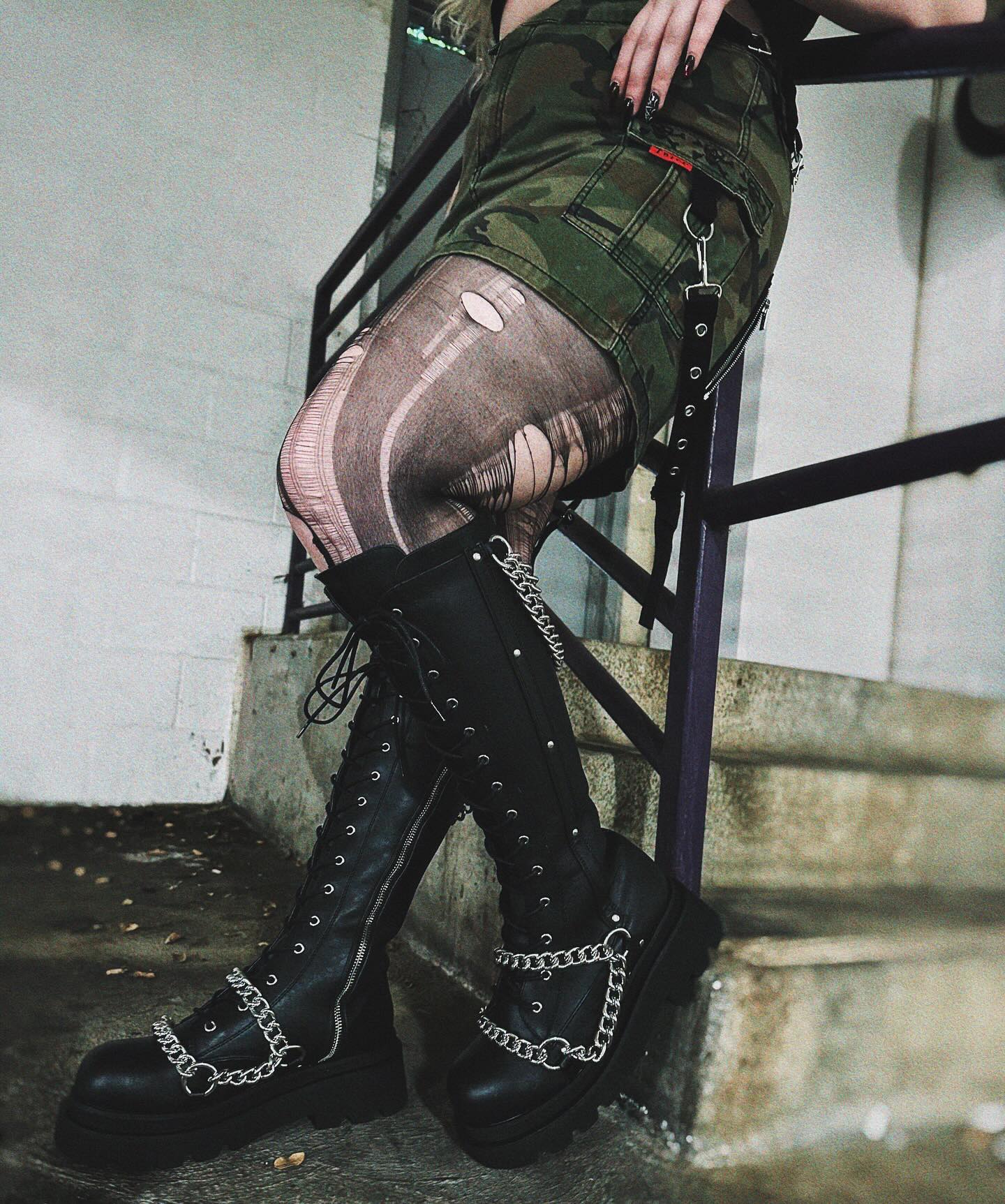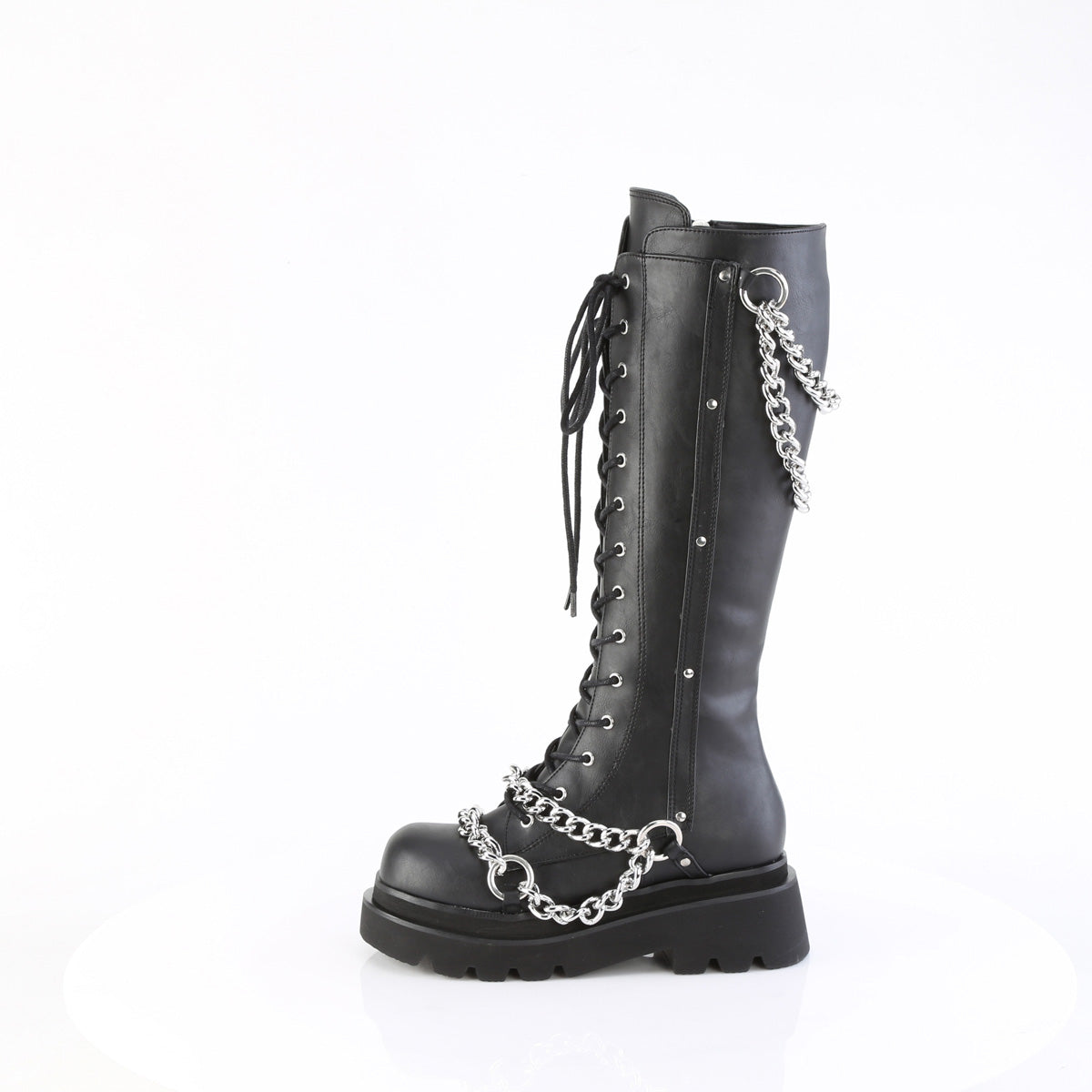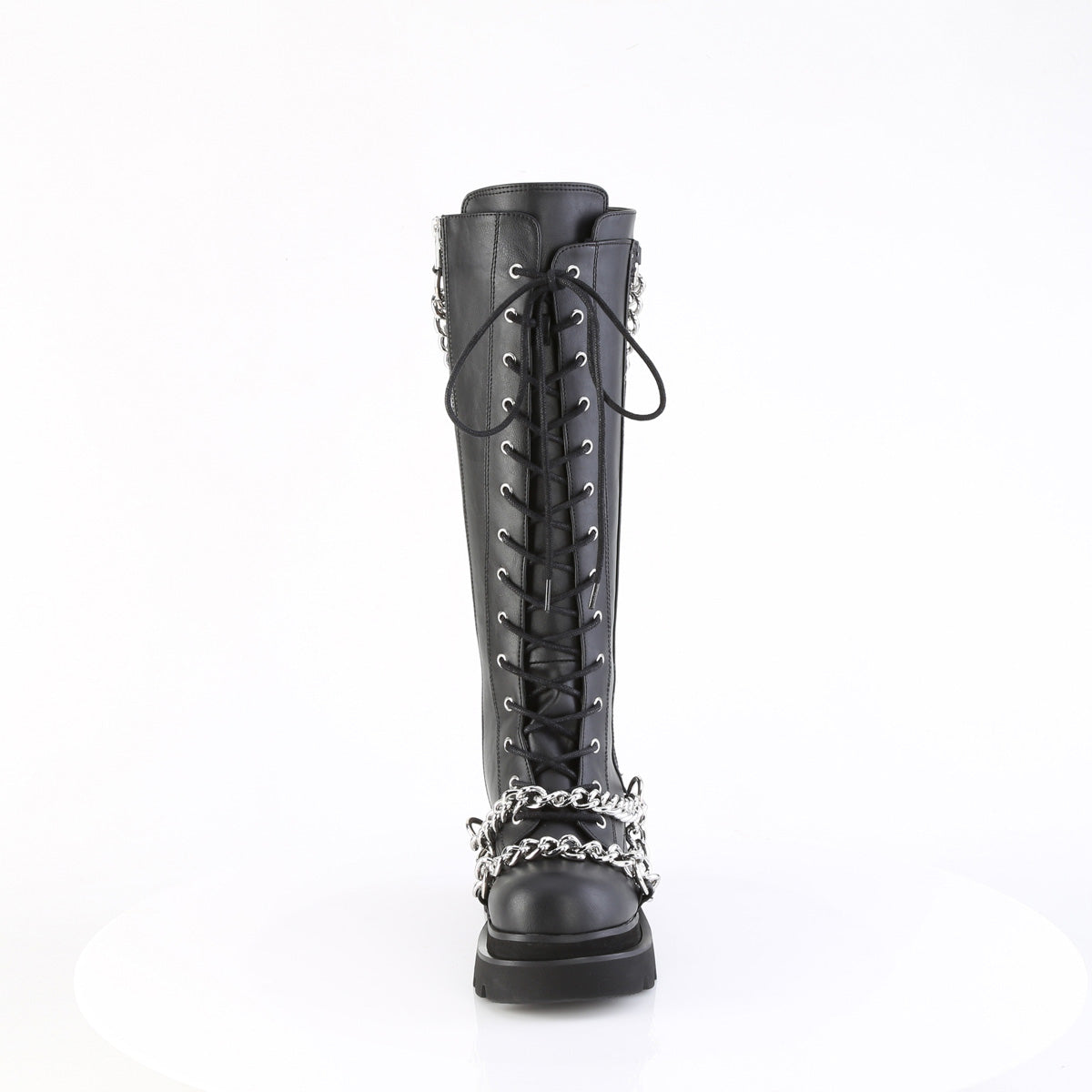 Make a bold fashion statement with these 2 1/2" tiered platform lace-up knee-high boots. Featuring an eye-catching swooping chains and O-ring details on the top and vamp, these boots are sure to turn heads wherever you go. The inside metal zip closure ensures easy and comfortable wear, making them a perfect choice for both style and practicality.