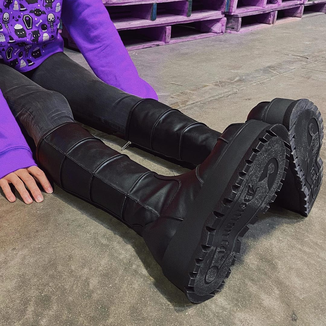 Stomp around in these funky 2" (51mm) platform knee high boot with patching details, and full length inside metal zip closure.