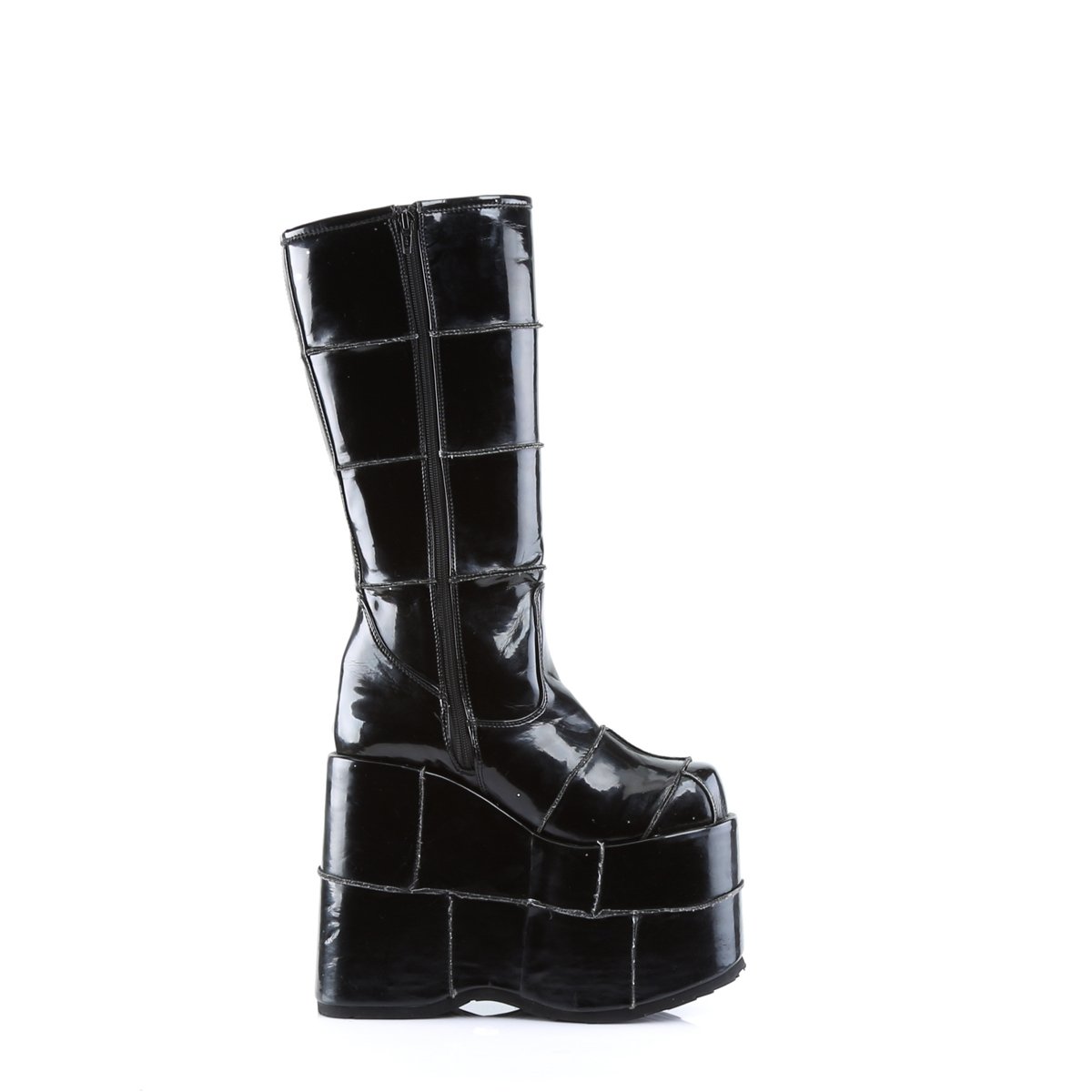 Cool platform boots featuring knee high boot with brick pattern on the boot, a high platform, a patent leather or PU upper and a side zipper for a secure and comfortable fit.