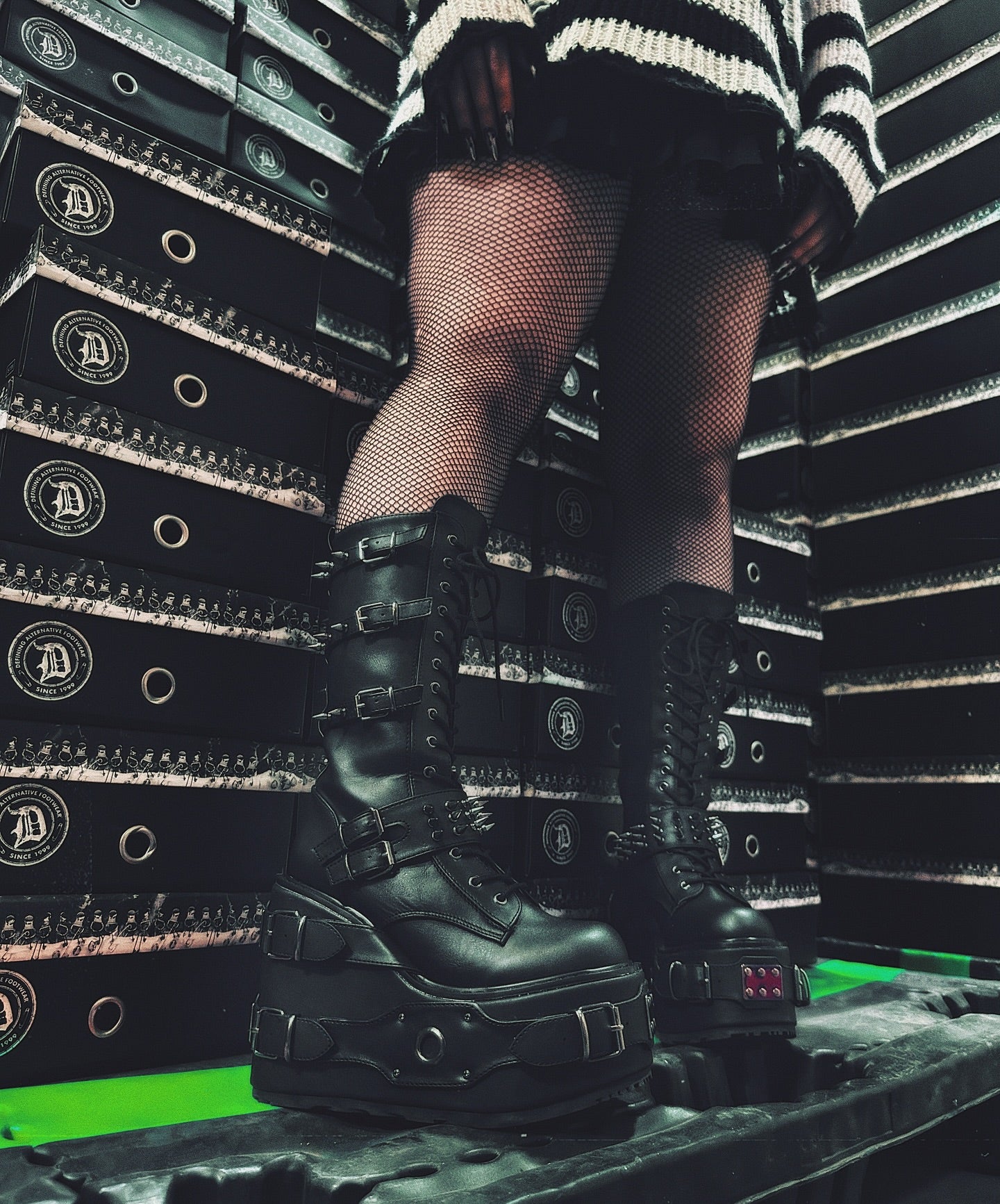 It's all about the buckles. Edgy 5 1/2"(140mm) platform wedge lace-up front knee high boot featuring multi metal spike adorned buckle straps & buckle straps with O-ring & metal plate detail on the platform, inside zip closure.