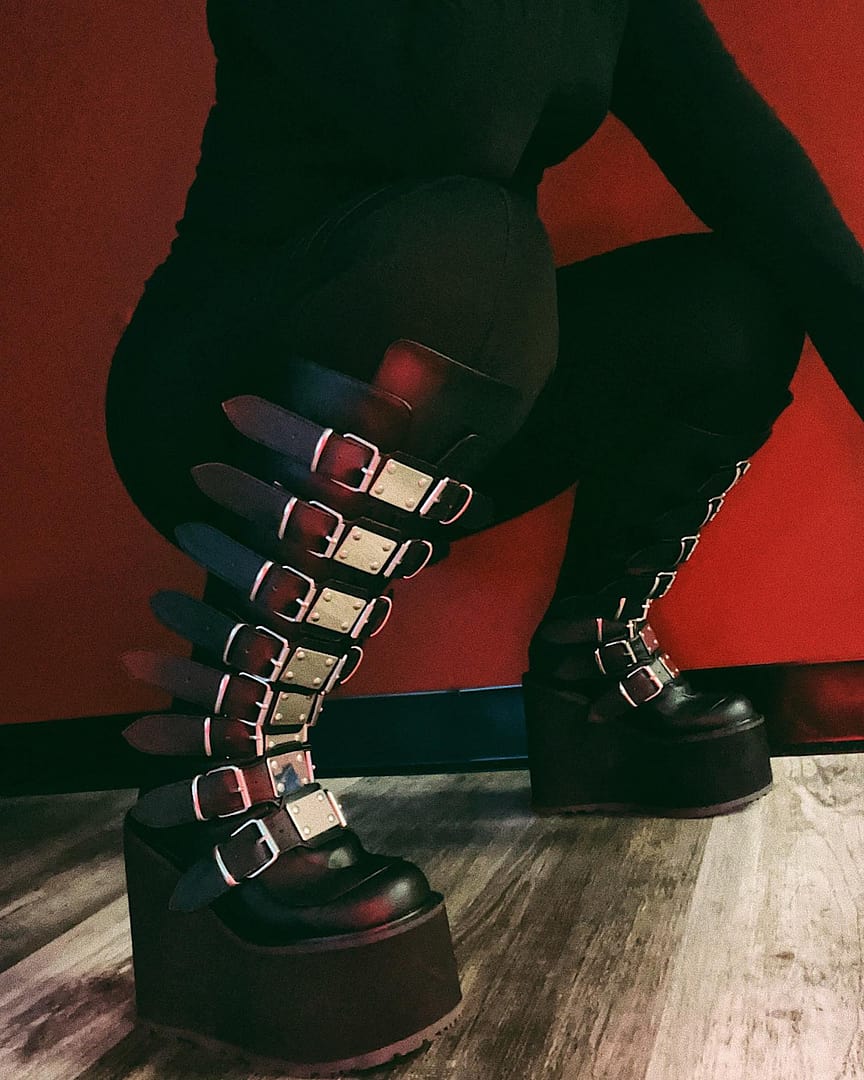 Pull on your boots and rock the day! A 5 1/2" (140mm) platform-wide calf knee-high boot featuring 8 buckle straps w/ metal plates at the center and back metal zip closure. (Calf circumference measures approximately 16.5")