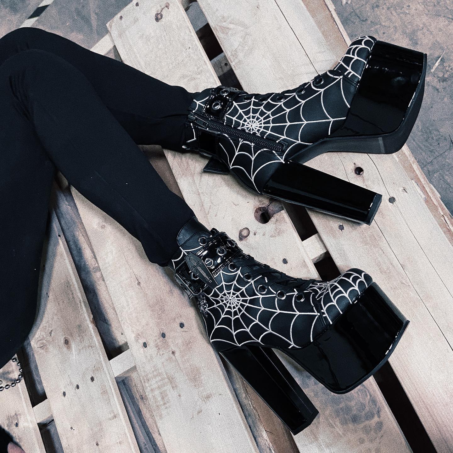 Spooky 5 1/2" (140mm) heel, 3" (76mm) platform lace-up front ankle boot featuring coffin buckle top strap & embroidered spider web detail with inside zip closure.