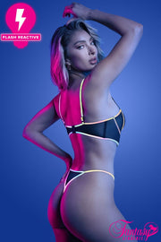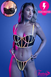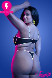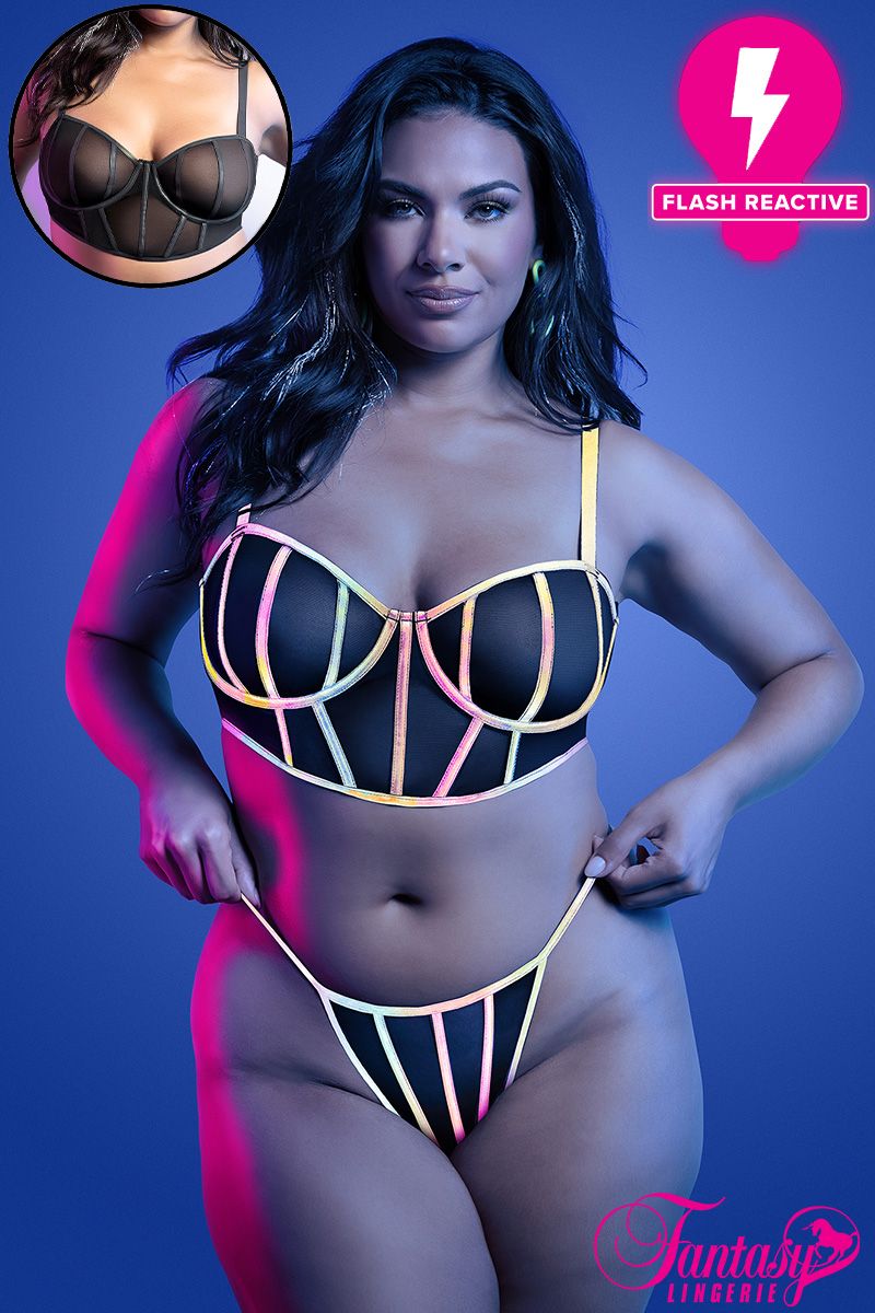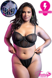 Longline mesh bra with flash reactive rigid boning, underwired cups, adjustable straps and an hook & eye back closure. Low-waist mesh thong with flash reactive boning