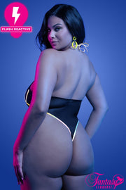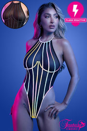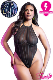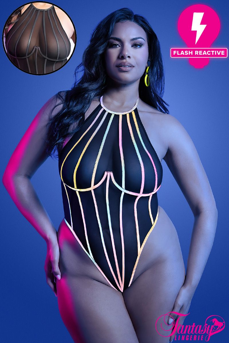 High cut mesh teddy with flash reactive rigid boning, underwired cups, a halter tie-neck collar and a snap crotch closure.
