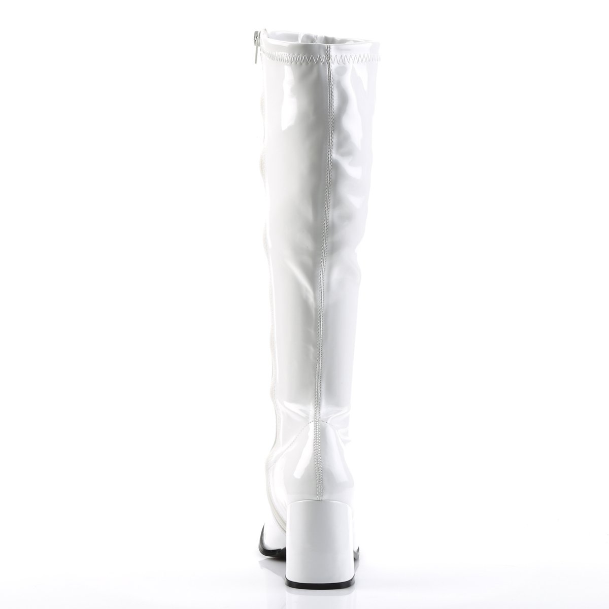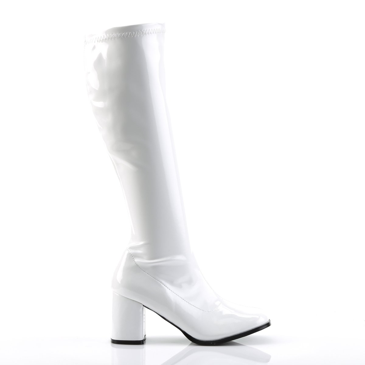 This knee-high style is made of shiny patent in a form-fitting shape with a mod, sixties design that'll keep his eyes glued on you. The retro inspired GOGO-300 knee high boot features a 3" block heel, stretch faux patent or faux leather uppers and a side zipper. These boots will be the perfect compliment to you Gogo Dancer