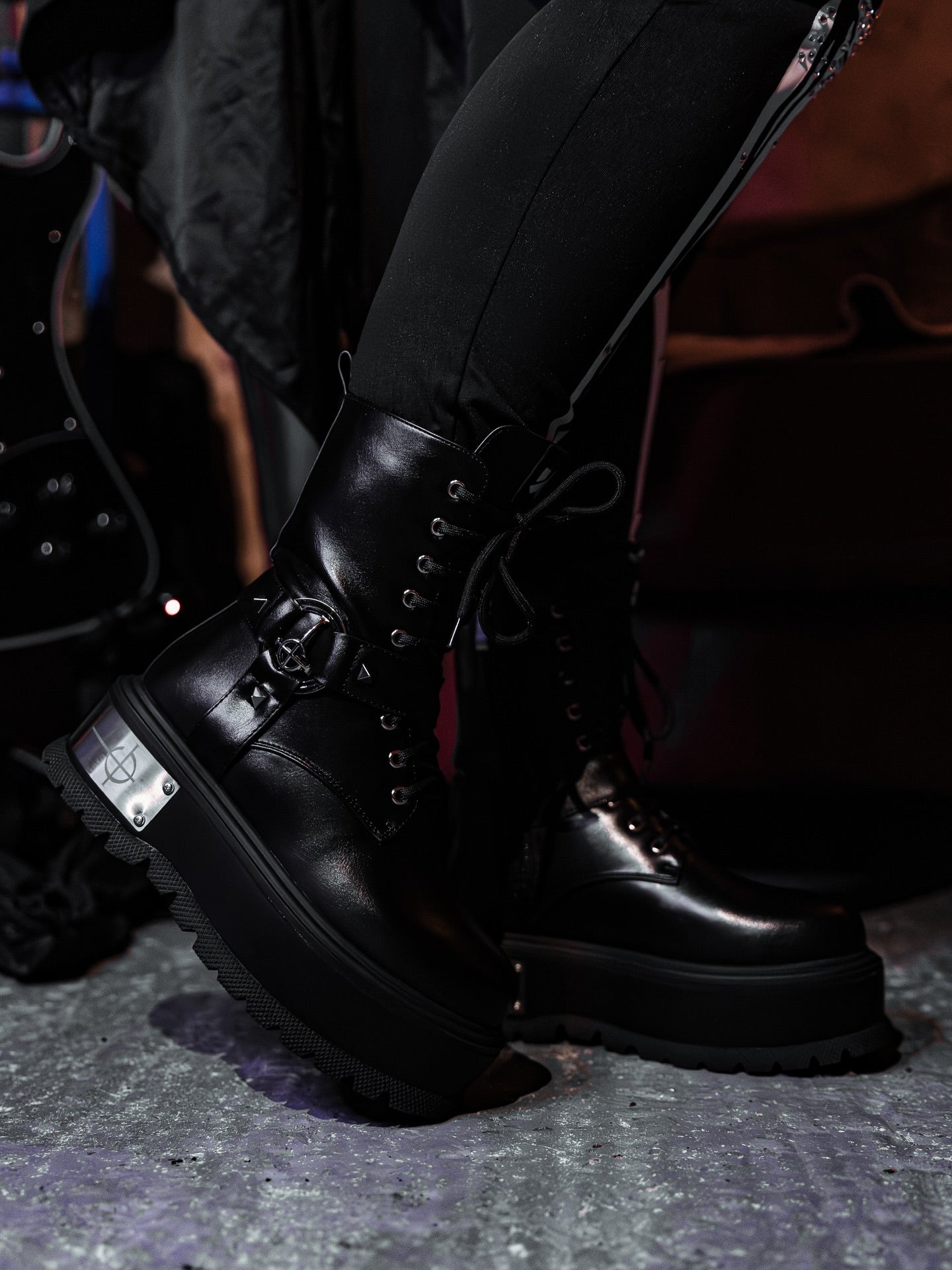 Crafted in sleek faux leather with a platform that commands the stage, these boots are loaded with bespoke hardware, custom metal detailing, and a crucifix plate forged in pure Papa energy. Every part is engineered for impact—from pit to pavement.