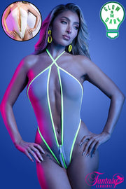 High leg sheer mesh teddy with a glow in the dark contrast binding, a very deep plunging neckline, a criss-cross halter tie-neck neckline and a zipper front-to-back closure.