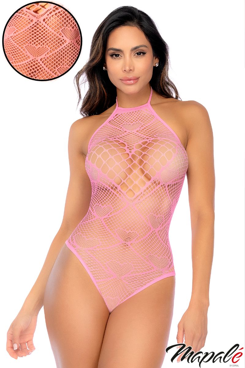 Heart fishnet teddy with a knitted net heart over the bust and a high halter tie-neck collar.