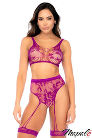 Soft and stretchy crop top with fixed straps and criss-cross elastics over the bust. High-waist floral net thong with a thick waistband and leg garters attached by fixed elastic garters.