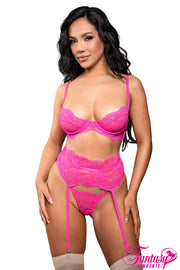 A lace bra with underwire, adjustable straps, and hook & eye closure. High-waist lace garterbelt thong with silky waistband and adjustable garters. Finished with a delicate lace G-string for a bold, sexy look.