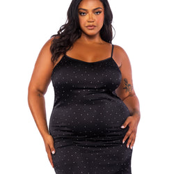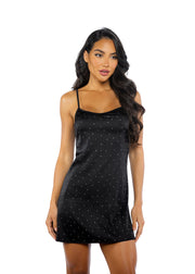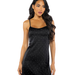 Satin with all-over front panel rhinestone detail, Straight neckline